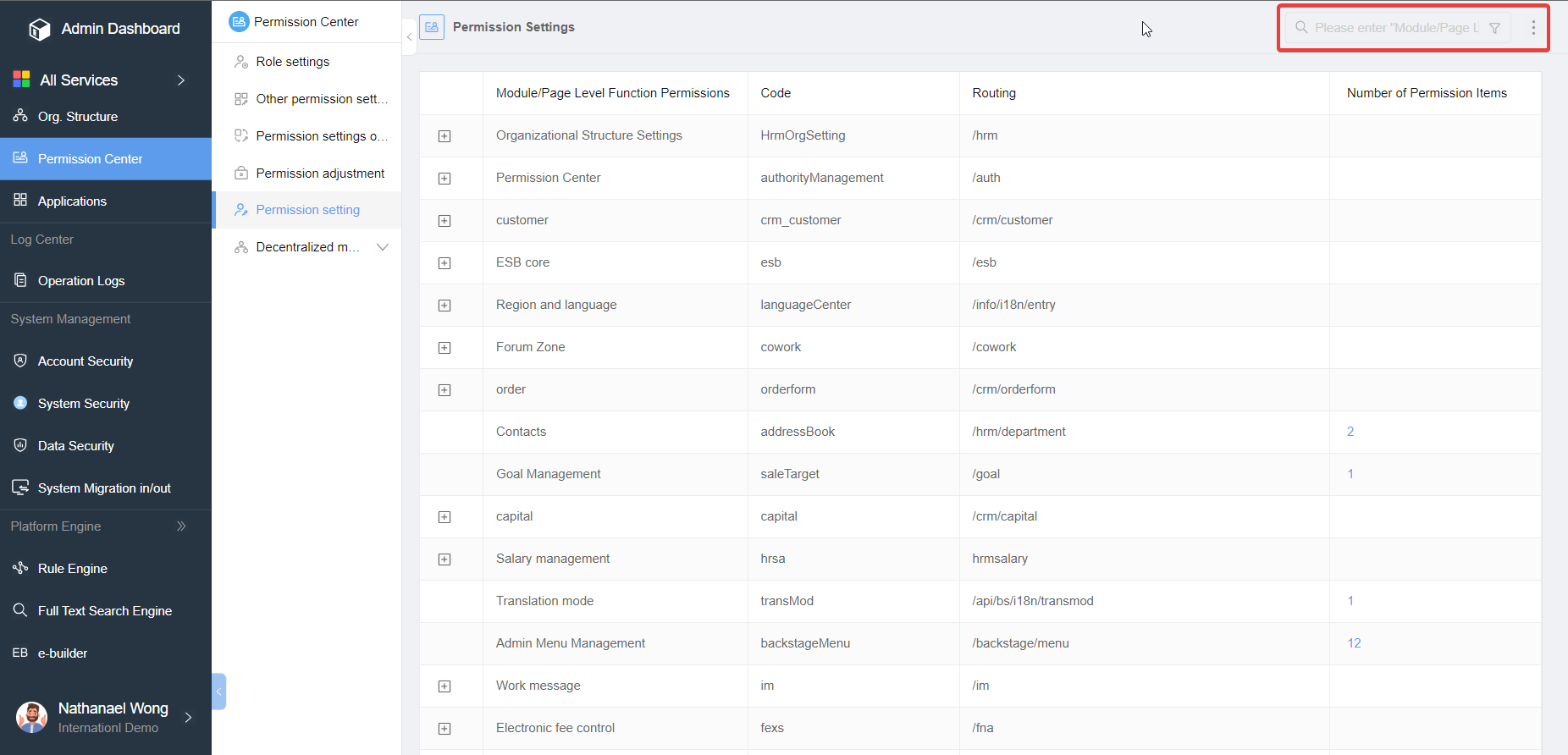 Similarly, you can also use the search box in the upper right corner of the page to quickly search for specific permission items by their names.