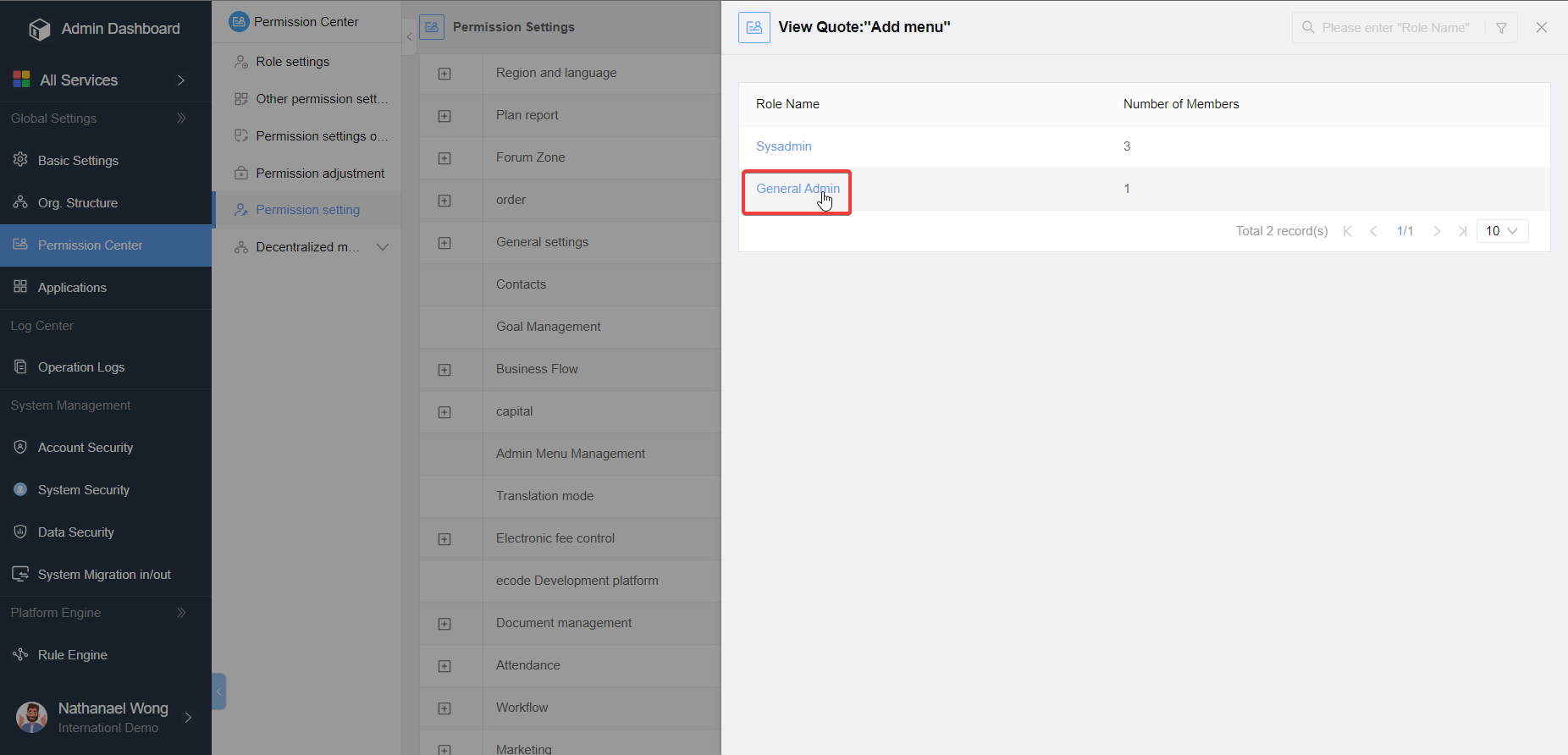 Clicking on the "..." at the rightmost side of the permission item list allows you to view invocation of the selected item. This will display information about roles that reference or use that specific permission item, including role names and the number of members in each role.